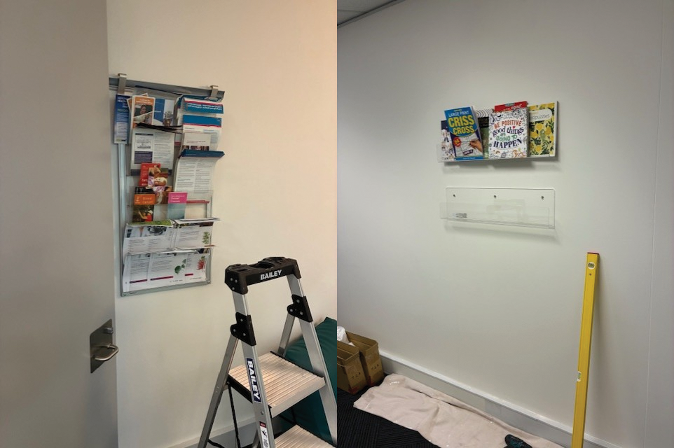 • Install x3 acrylic bookshelves supplied by site